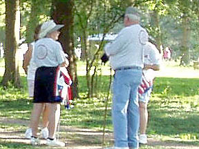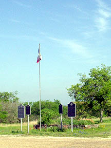 | Flagpole with historical markers in what was the town square. One marker tells how the Sante Fe Railroad was refused right-of-way to go through town and how the town eventually died. |
